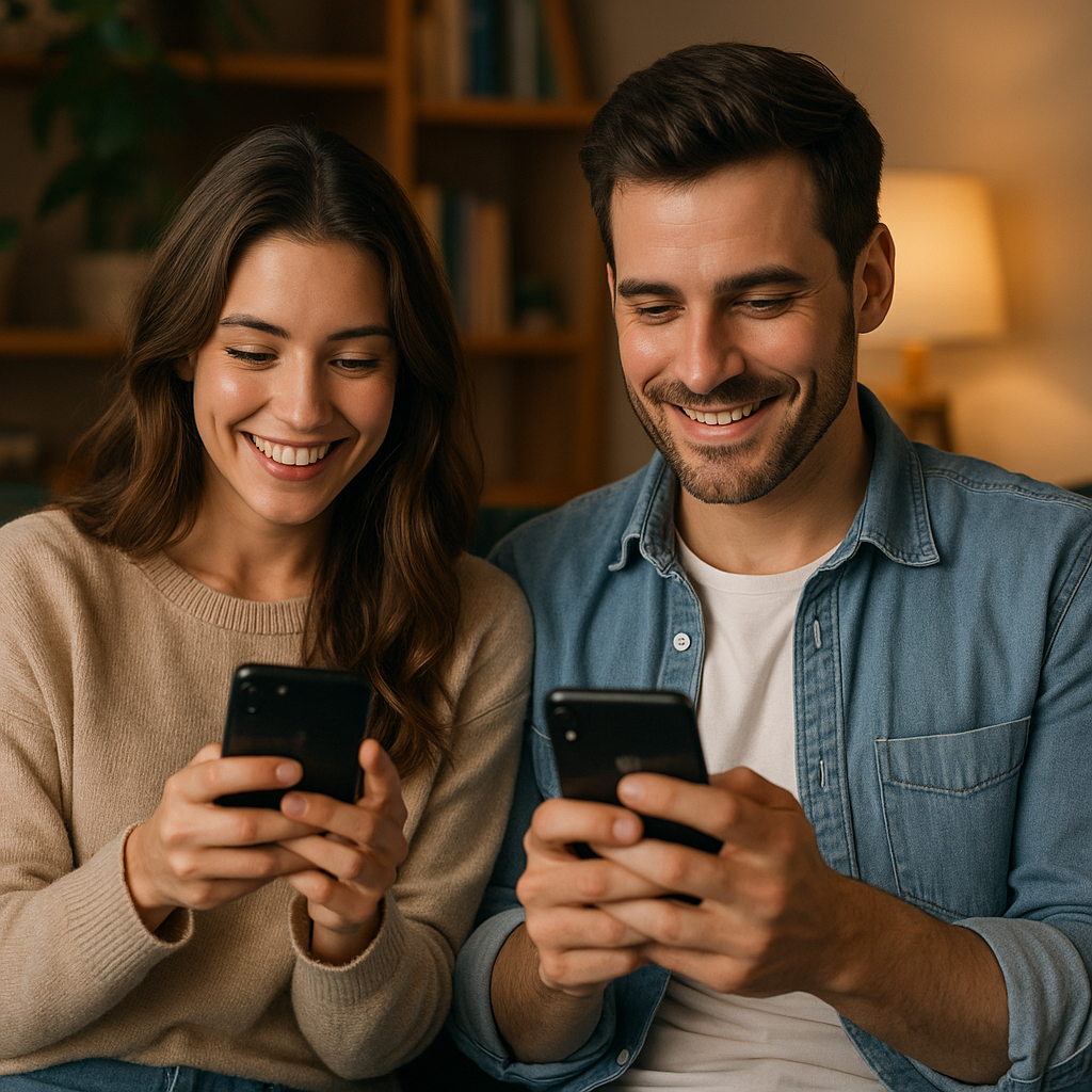 Image: Couple exploring dating apps together in a cozy home environment.