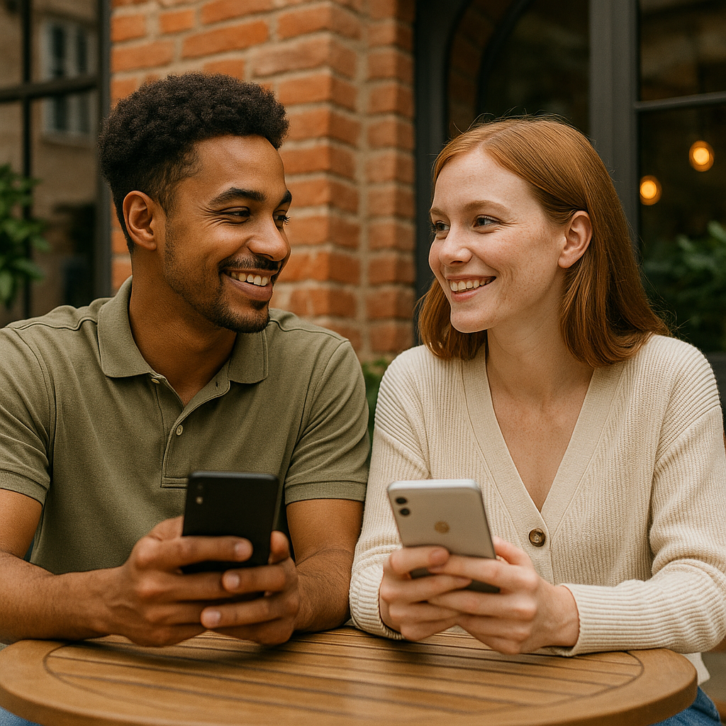 Image: Couple using dating apps together in a relaxed outdoor cafe.